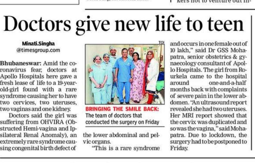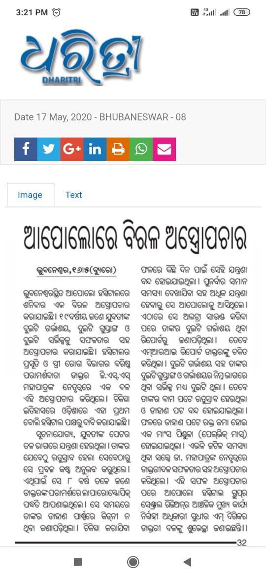 - Received ODIA R GAURAV SAMMAN 2010 for successfully removing a 15 kg ovarian tumour