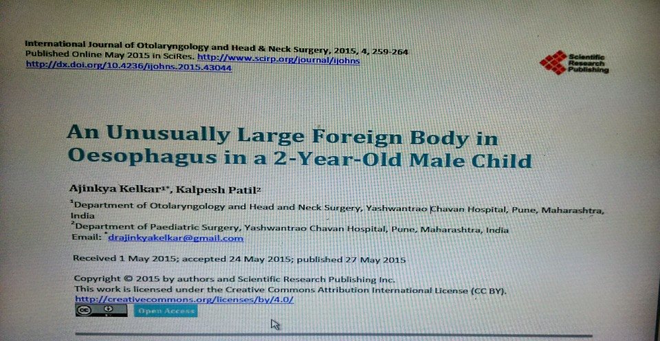 - An Unusually Large Foreign Body in Oesophagus in a 2-Year-Old Male Child; IJOHNS> Vol.4 No.3, May 2015 (International Journal of Otolaryngology and Head & Neck Surgery, 4, 259-264. doi: 10.4236/ijohns.2015.43044.)