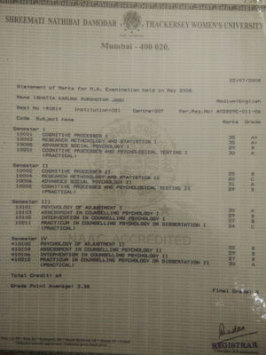 M.A. in Counselling Psychology, 2008, SNDT University, Mumbai, India