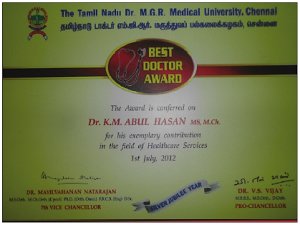 - Best Doctor Award by The Tamil Nadu Dr. MGR Medical University at Chennai
