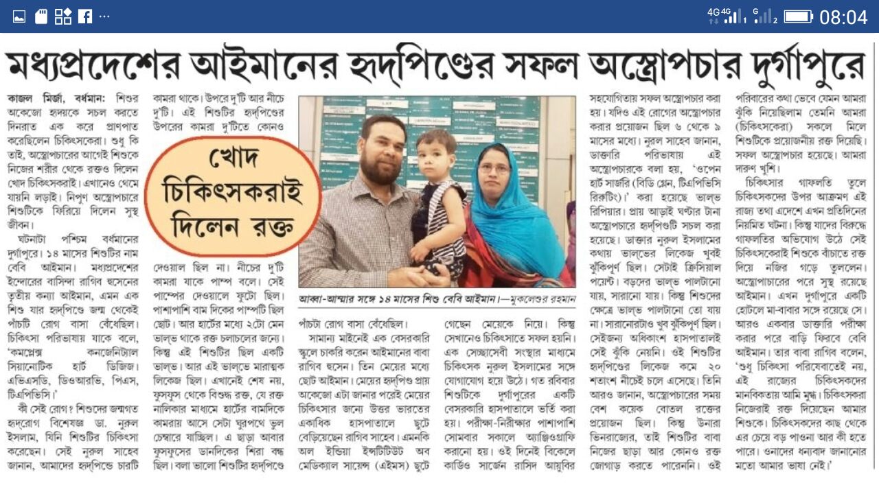 - The small baby Ayman from Bhoopal. MP with complex heart problem was rejected for cardiac surgery because of high risk, got operated under supervision of Dr. Nurul Islam.....now enjoying her life family...covered in leading Newspaper....