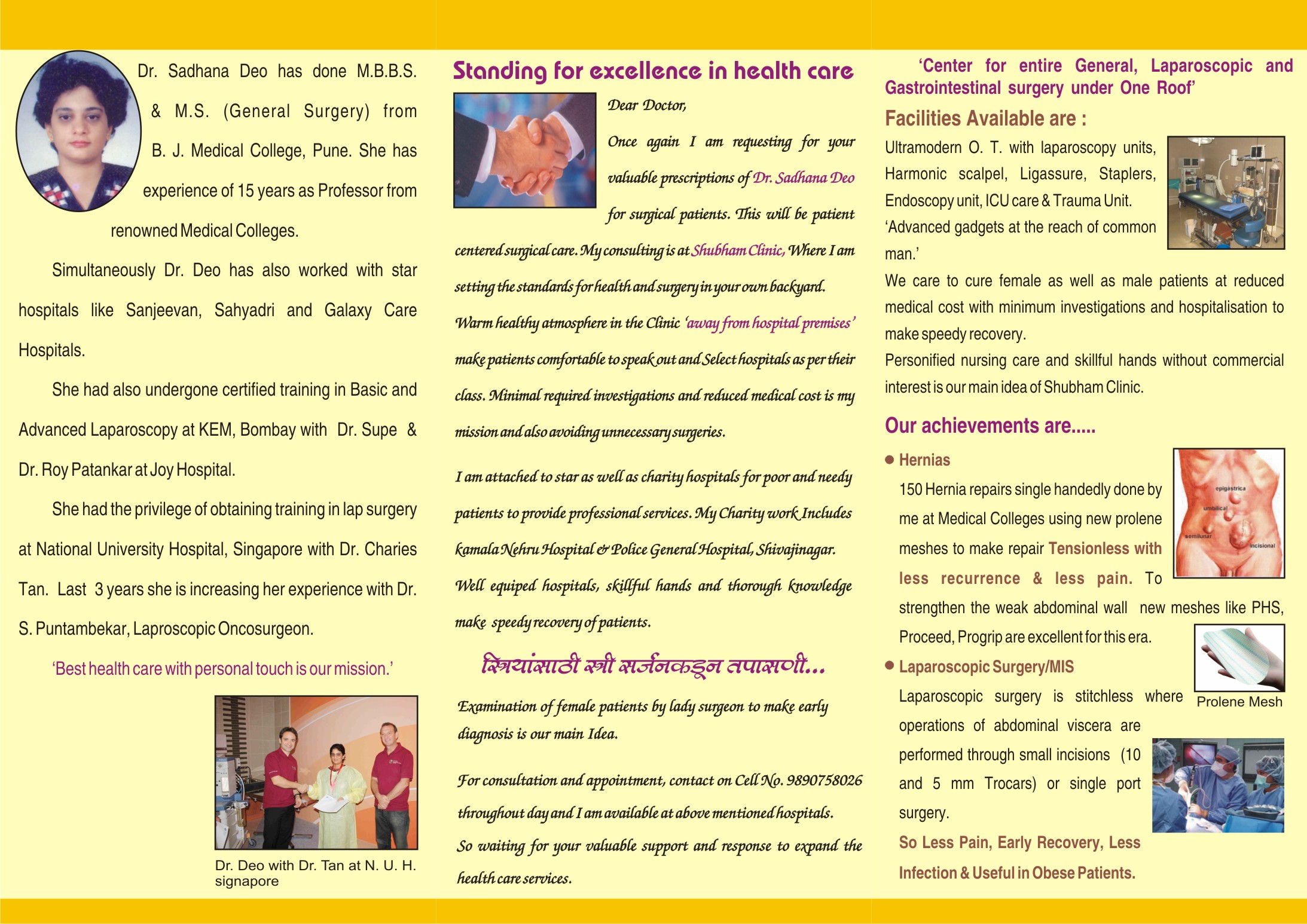 - 1]HAVE CONDUCTED FREE CAMPS FOR PATIENTS OF HERNIAS,BREAST LUMPS,LAPAROSCOPIC SURGERY,PILES,FISTULAS,GASTROENTEROLOGY PROBLEMS FOR LAST 10 YEARS WITH HELP OF SAKAL NEWS PAPERS. 2] AWARDED LAPAROSCOPIC SURGERY AWARD IN 2008 AT SINGAPORE HOSPITAL 3] BEST FEMALE SURGEON AWARD ON WOMEN'S DAY 8/3/2015AT TANISHQ